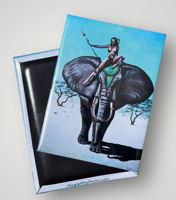 In Alter Ego, a powerful nude warrior woman confidently straddles the head of a majestic elephant, spear in hand, poised against a bright turquoise sky. Set in an abstract African savanna, the image evokes themes of strength, freedom, and duality --- a striking contrast to Ray Rolston's typical island palette.